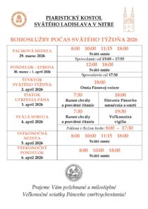Na priloženom obrázku si môžete pozrieť program slávení v našom Piaristickom kostole svätého Ladislava v Nitre počas Veľkonočných sviatkov 2022.